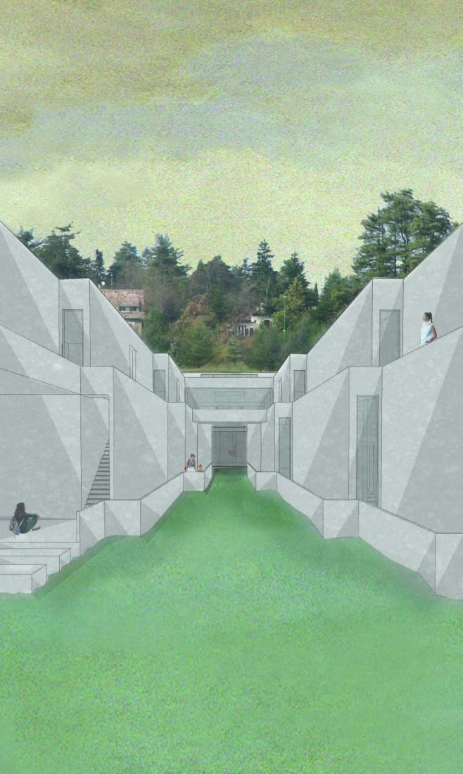Le bassin de Saint-Ferréol est un site emblématique du sud-ouest. C’est dans ce paysage entre eau, forêt et montagne que se développe le projet. Celui-ci consiste à créer une salle de spectacle, programme né d’enquêtes réalisées auprès des associations locales. Le projet questionne les notions d’architecture, de paysage et de spectacle ainsi que les rapports qu’ils tissent entre eux. Il s’intègre donc dans la topographie, s’affirmant comme un canal creusé dans la roche friable, amenant l’eau au cœur de la berge. Le bâtiment enterré se déploie de part et d’autre de ce chemin d’eau. Les espaces s’ouvrent sur le ciel et le paysage offrant des vues particulières sur le bassin. Le paysage devient le prolongement du bâtiment, atténuant les limites entre intérieur et extérieur. Le projet est travaillé comme un bâtiment-spectacle dont chaque espace est scénarisé et mis en scène à travers des jeux de lumières et d’ambiances. L’architecture est réglée en fonction de la course du soleil, mais le soir venu, elle devient à l’inverse une source de lumière sur le bassin.