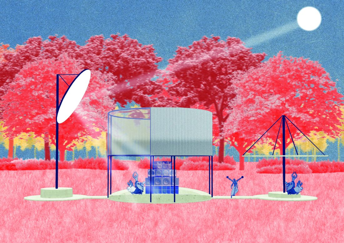 Ce projet est une ode à la nuit, à la fête. Il est ici question d’une fête contemporaine, urbaine et effervescente, rythmée par des sons électroniques, qui prend vie dans l’obscurité des entrepôts, sur des terrains vagues, dans des clairières ou au fond des forêts. Un espace transgressif traversé par des corps singuliers, des identités mouvantes, des sexualités en mutation. Espace d’émancipation et d’apprentissage, où les corps expérimentent d’autres manières d’être ensemble. En dépliant les strates de la fête, il devient manifeste qu’elle est politique, militante, éducatrice. Elle se révèle également comme une machine organique faite de sons, de lumières, de flux, d’usagers, d’atmosphères. La fête fonctionne comme un écosystème. Ce projet s’inscrit dans cette dynamique : il propose une architecture comme outil, non pas pour figer la fête, mais pour en esquisser les conditions.