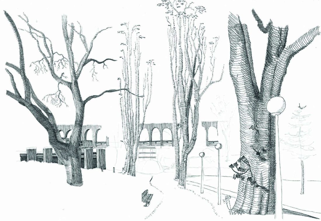At the foot of the Arcueil aqueduct, beneath a layer of tar, flows a buried river: the Bièvre. The project, located on the historic “Fief des arcs” in Cachan, explores the memorial issues raised today by the reopening of this river in a suburban environment. Formerly occupied by a hunting estate with slender poplars, then by a hospice and its formal garden, the site has been home to a vast EHPAD since the 1980s, and is now partially unoccupied. The intertwining of memories and the sustenance of vegetation bear witness to the relationship between the living and the forgotten. Weaving a new link between this site and the underground river is an opportunity to take a contemporary look at the living world that inhabits its former banks, and to reflect on the ageing of the Bièvre Valley landscape. It’s also an opportunity to explore a landscape teeming with roots and rhizomes, which are by no means inert bodies with finite potential.