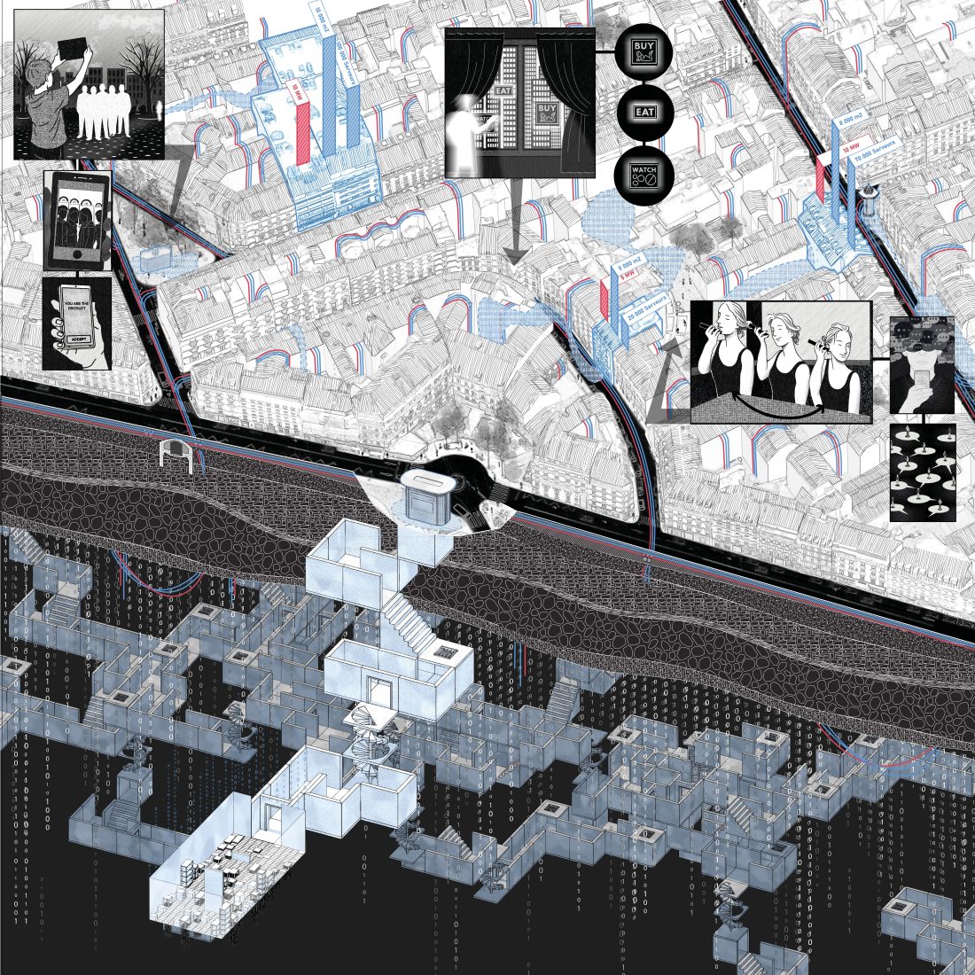 Ce projet de fiction spéculative explore les moyens de résister aux logiques dominantes du numérique contemporain — centralisé, opaque, extractiviste — en imaginant une culture numérique critique, située et incarnée. Face à la dissimulation matérielle croissante des infrastructures comme les data centers, le projet propose de réinvestir l’espace urbain, théâtre de tensions entre visibilité et opacité, par des gestes discrets mais significatifs. La fiction met en scène « Les Latents », une communauté distribuée de journalistes, activistes et lanceurs d’alerte. Ils déploient leur présence à travers trois types d’espaces complémentaires : les Cellules, bases discrètes d’action cachées dans le tissu urbain ; les Lieux de connexion, espaces sécurisés de coordination ; et les Pop-ups, installations éphémères qui perturbent brièvement le quotidien pour transmettre leurs messages. Ces formes spatiales permettent une résistance douce mais déterminée, fondée sur l’opacité, la lenteur et la relation. En mobilisant la fiction comme méthode, « Les Latents » propose une écologie de gestes et d’architectures qui réaffirment le droit à la dissidence numérique et à la réappropriation des technologies.