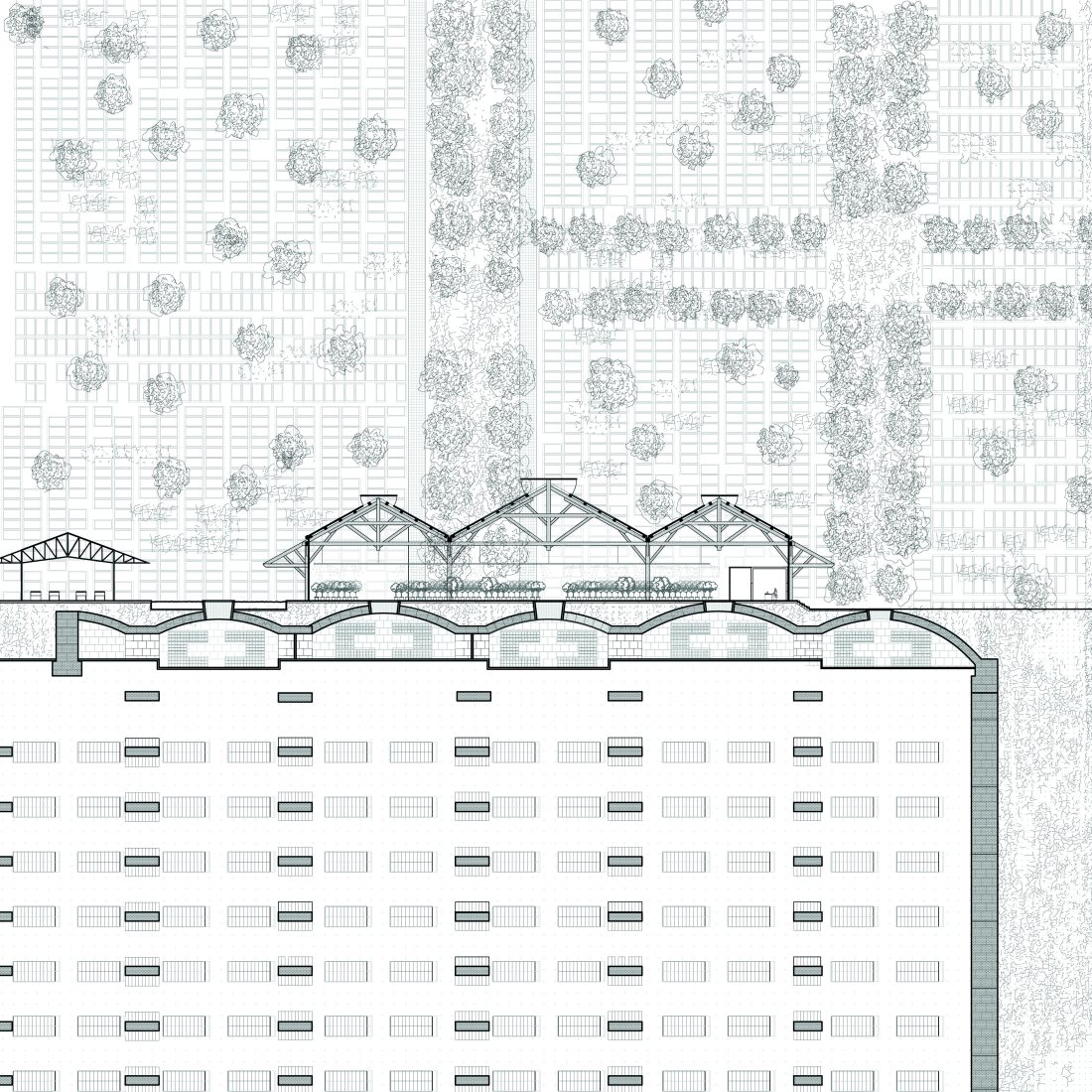 Installée dans l’ancienne gare de Bercy, la « Pépinière du souvenir » transforme un site industriel à l’abandon en espace de vie, de recueillement et de production. Au sous-sol, la massivité des voûtes en pierre accueille les ossements des tombes abandonnées des cimetières parisiens. Les tombes retirées laissent place à des inhumations vertes, aux pieds de nouveaux arbres propices au recueillement. Près de l’ossuaire, un crématorium accompagne les endeuillés dans un dialogue apaisé avec la mort. En surface, les grandes halles deviennent pépinières, au service de la végétalisation des cimetières, créant un cycle entre mémoire et vivant. Le site se transforme en un parc qui suture la ville et le quartier, offrant des espaces de fraîcheur et de spiritualité.