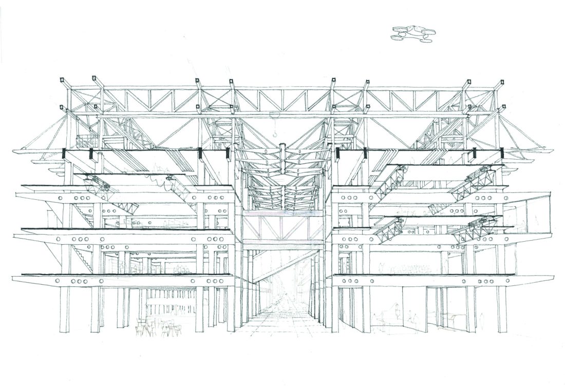 We envisioned an open, permeable, hybrid incubator where students and residents could meet. It is based on a modular grid extended from Christian Hauvette’s original structure, seen as an architectural machine. Movable slabs adjust space to needs, evoking a cybernetic architecture that evolves constantly.