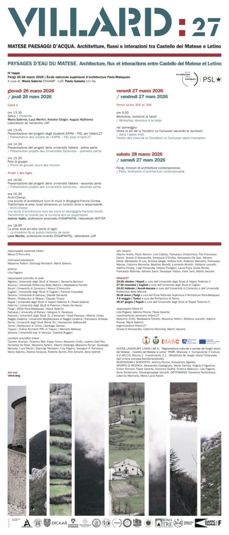L’école accueille, les jeudi 26 et vendredi 27 mars 2026, le séminaire Villard 27 sur le thème « paysages d’eau du Matese – Architecture, flux et interactions entre Castello del Matese et Letino », une rencontre organisée par Maria Salerno et Paola Galante.